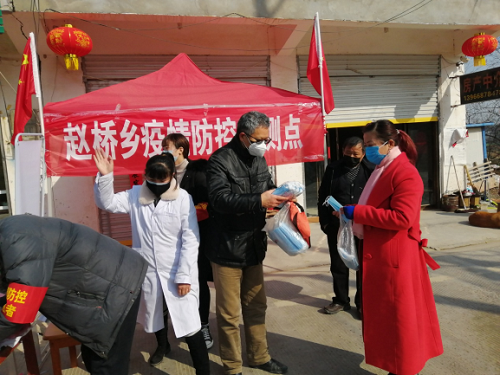 华安证券驻村扶贫工作队队长潘鹏飞带领队员在卢张庄村防控卡点发防护口罩