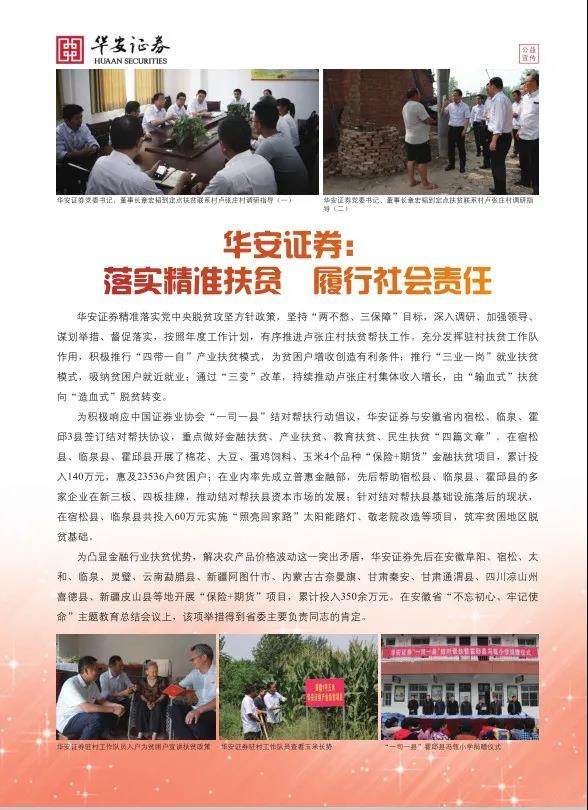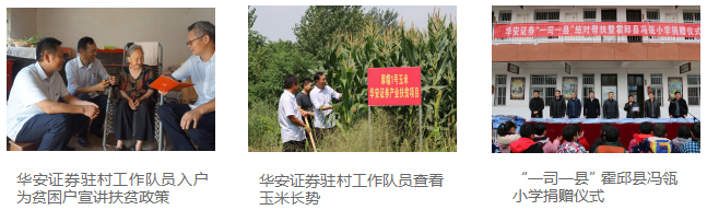 为积极响应中国证券业协会“一司一县”结对帮扶行动倡议,华安证券与安徽省内宿松、临泉、霍邱3县签订结对帮扶协议,重点做好金融扶贫、产业扶贫、教育扶贫、民生扶贫“四篇文章”。在宿松县、临泉县、霍邱县开展了棉花、大豆、蛋鸡饲料、玉米4个品种“保险+期货”金融扶贫项目,累计投入140万元,惠及23536户贫困户;在业内率先成立普惠金融部,先后帮助宿松县、临泉县、霍邱县的多家企业在新三板、四板挂牌,推动结对帮扶县资本市场的发展;针对结对帮扶县基础设施落后的现状,在宿松县、临泉县共投入60万元实施“照亮回家路”太阳能路灯、敬老院改造等项目,筑牢贫困地区脱贫基础。