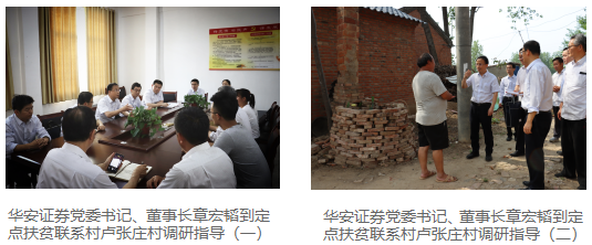 华安证券精准落实党中央脱贫攻坚方针政策,坚持“两不愁、三保障”目标,深入调研、加强领导、谋划举措、督促落实,按照年度工作计划,有序推进卢张庄村扶贫帮扶工作,充分发挥驻村扶贫工作队作用,积极推行“四带一自”产业扶贫模式,为贫困户增收创造有利条件;推行“三业一岗”就业扶贫模式,吸纳贫困户就近就业;通过“三变”改革,持续推动卢张庄村集体收入增长,由“输血式”扶贫向“造血式”脱贫转变。