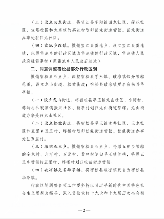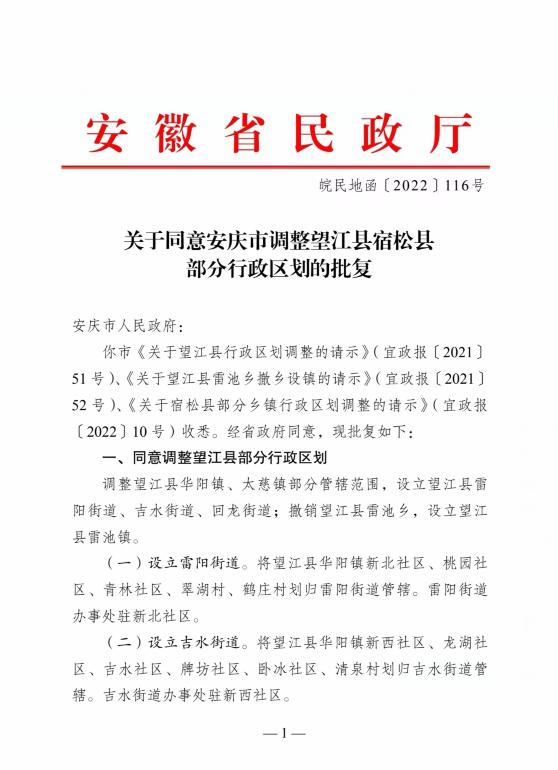 根据安徽省民政厅关于同意安庆市调整望江县宿松县部分行政区划的批复,同意望江县部分行政区划,调整望江县华阳镇、太慈镇部分管辖范围。设立雷阳街道,设立吉水街道,设立回龙街道,雷池乡改镇。