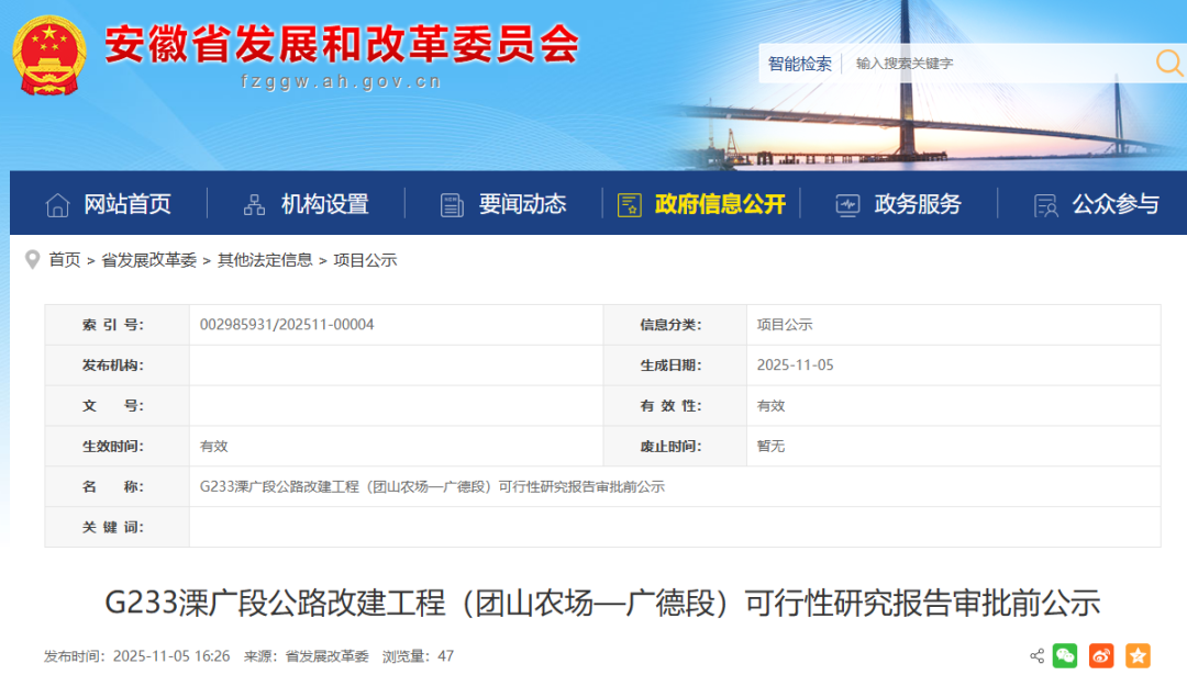 现将G233溧广段公路改建工程(团山农场—广德段)可行性研究报告审批内容予以公示。公示时间自公示之日起10个工作日(11月5日—11月18日),如有意见和建议,请以来人或署名来信(包括电子信函)方式向省发展改革委基础设施发展处反映,并提供姓名及联系电话,对匿名方式提出异议的不予受理。